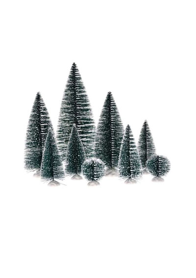 Sada ihličnatých stromčekov v rôznych výškach. Sada obsahuje: 4ks 11 cm, 2ks 5 cm, 2ks 14 cm, 1 ks 22 cm, zeleno-bielej farby.